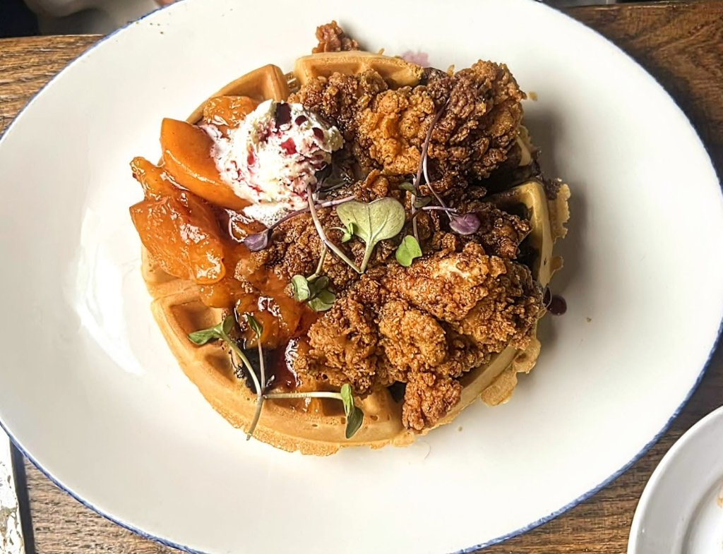The Chicken and Waffles were topped with cooked peaches and were the perfect combo of sweet and savory.