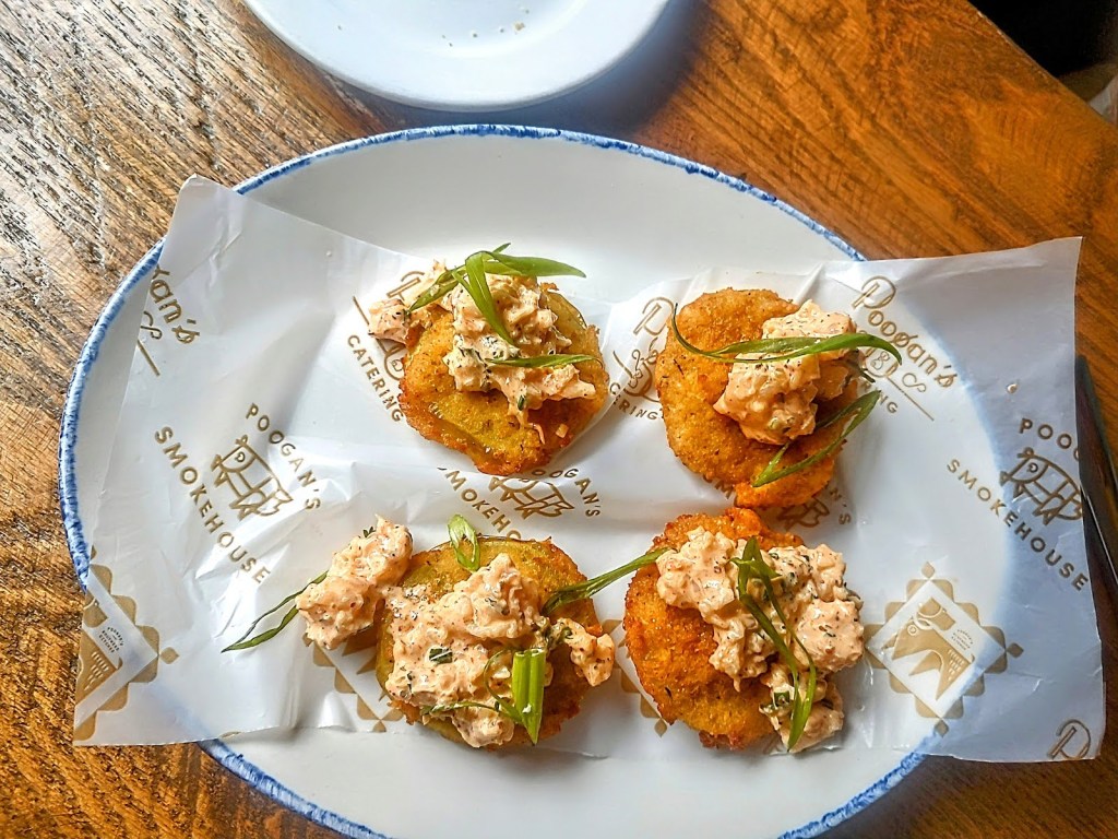 Neither the food, nor the mimosas, disappointed us. To start were biscuits with butter, fried green tomatoes, and pimento cheese fritters served with bacon jam. Each were perfect in their own right.